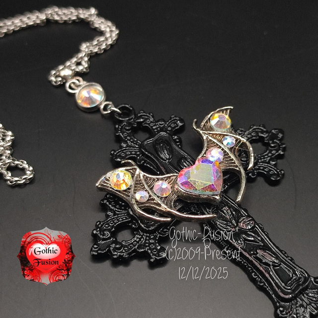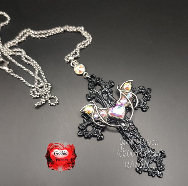 I have for you today a beautiful and large black cross necklace. The necklace is a reproduction of a Victorian hand carved design and finished in black. Adorned with an open wing bat detailer at is embellished with a single aurora crystal heart in the centre and smaller aurora rhinestones for a touch of extra sparkle.