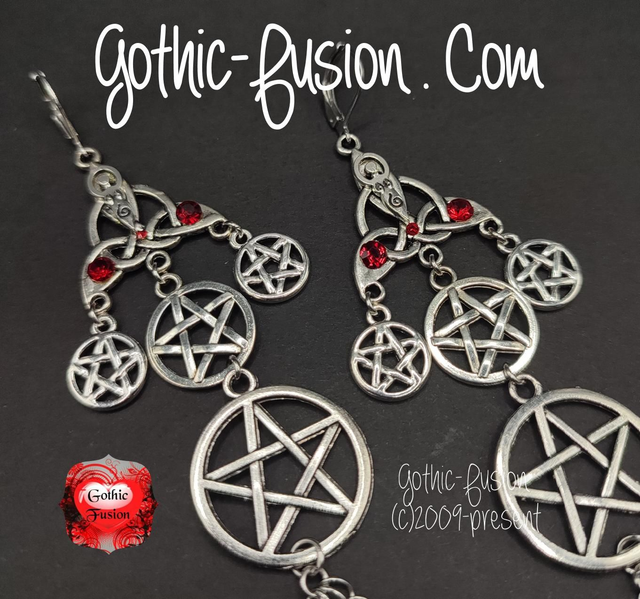 Goddess Statement Quadruple Pentacle Earrings with Red Chatons